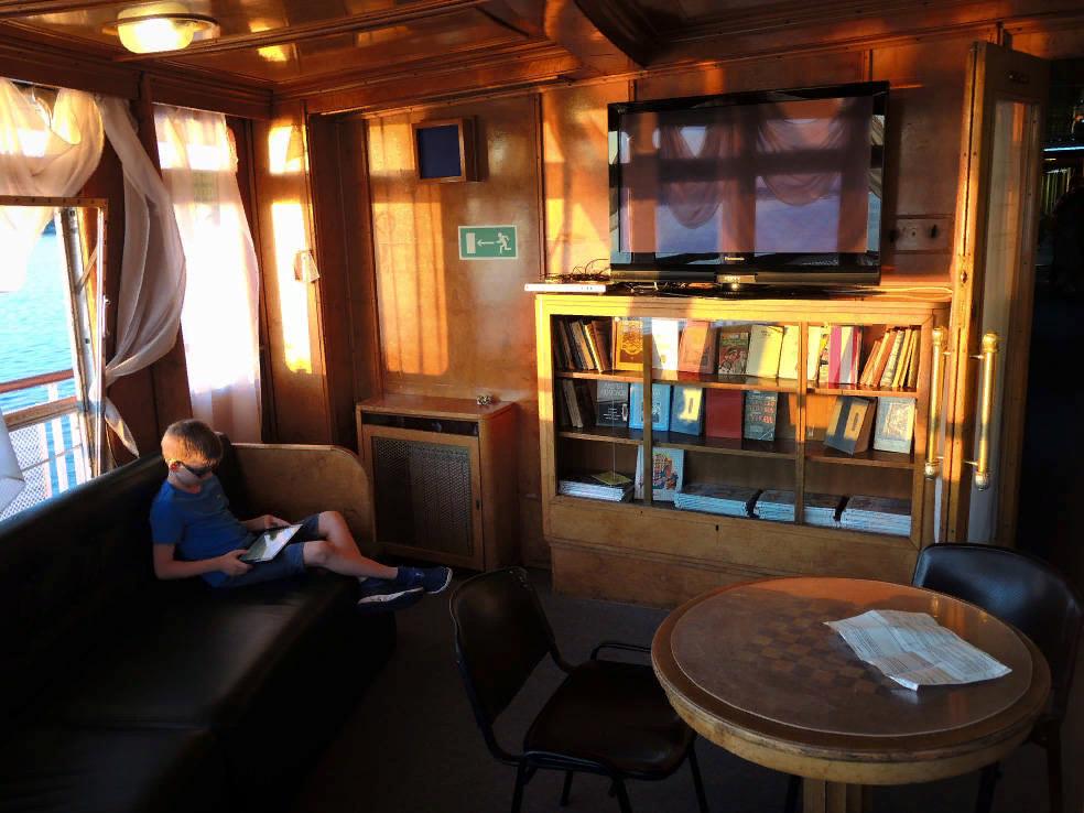Для круизеров оборудована небольшая библиотека, есть шахматный столик и уютные мягкие диваны, которые приглашают уединиться с книгой, забыв о суете повседневности.